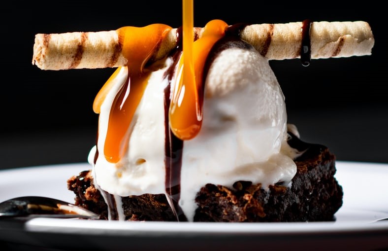 A warm, chocolatey, messy, gooey brownie, full of caramel, melting chocolate and topped with ice cream.